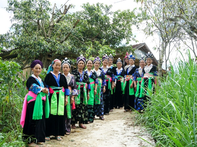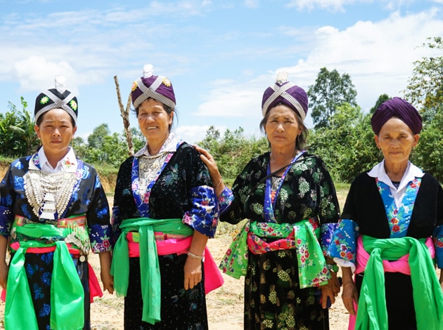 Les femmes H’mongs de Pha Xac portent des vêtements traditionnels pour le festival du Nouvel An, les mariages, les funérailles, les journées de marché et autres occasions spéciales. Leur costume traditionnel comprend un large pantalon noir (hu tin) et une tunique noire (lu slo) avec un col richement brodé. Une fille est considérée comme étant très attirante quand elle porte une ceinture brodée et plusieurs bandes rose et verte autour de ses hanches. Un grand collier en argent (lu nhia) lui fournira une parure supplémentaire. Les sacs à main brodés, qui étaient à la base des sacs à opium, et un turban (phu chong slua) sont également portés lors des occasions spéciales du village. Le turban est composé de plus de dix mètres de soie violette maintenue par un autre ruban rayé (chang).