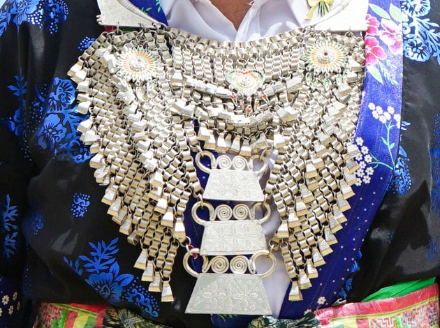 Col (tau) : Le col des vêtements traditionnels des femmes distingue un groupe de H’mong d’un autre et démontre les talents manuels et artistiques d’une femme. À l’aide d’une petite paire de ciseaux, elle découpe un motif complexe dans un mince morceau de tissu, puis avec de minuscules points de suture, applique le tissu coupé sur la deuxième couche de tissu. Elle ajoute ensuite de la broderie. Les applications et les motifs de broderie varient, ceux-ci étant inspirés de la vie quotidienne. Ils peuvent par exemple représenter une fleur de pêcher, un escargot, un oiseau, l’empreinte de pied du poulet, le joug et le mortier pour pilonner du riz, une croix ou un pont.
