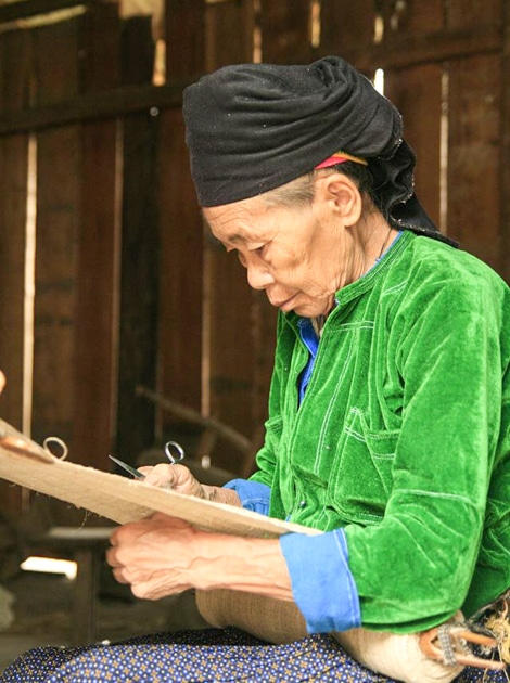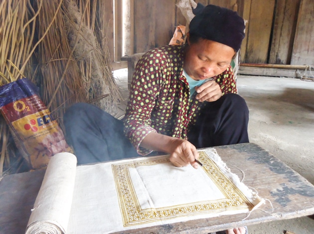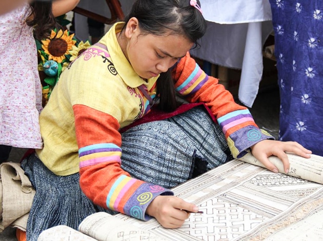 Depuis des temps très anciens, les H’mong au nord du Vietnam décorent leurs vêtements de motifs représentant leur culture et leur vie quotidienne. Le costume traditionnel de cette ethnie est célèbre pour la technique particulière du batik à la cire d’abeille et le tissage artisanal du chanvre. Les H’mong sont très fiers de porter leurs vêtements faits main et les jupes plissées des femmes sont considérées comme particulièrement belles. En admirant le batik élaboré par les talentueuses femmes H’mong, on reconnaît leur habileté et leur attention portée aux détails de ces magnifiques créations. Chaque batik est unique car il est le résultat de la créativité de son artisane et non d’un modèle ou guide.