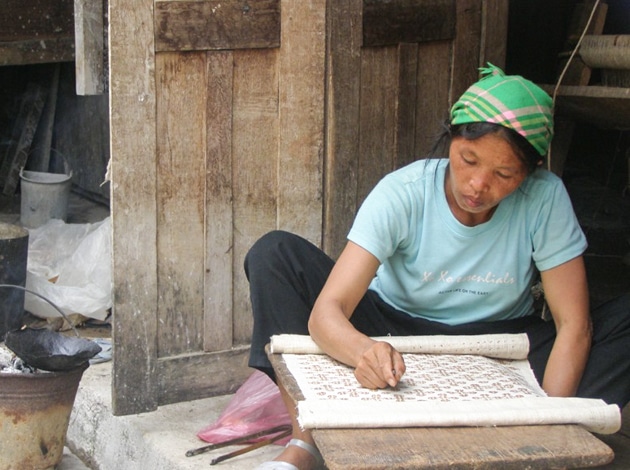 Une fois le tissu préparé et repassé, les femmes Hmong confectionnent le batik en utilisant la cire d’abeille fondue pour peindre à sa surface. Elles utilisent plusieurs stylos de bambou ayant à une extrémité une plume en cuivre. Elles plongent les stylos, appelés « tjanting », dans un bol de cire chaude placé sur un charbon de bois avant de dessiner les motifs traditionnels sur le tissu de chanvre blanc.